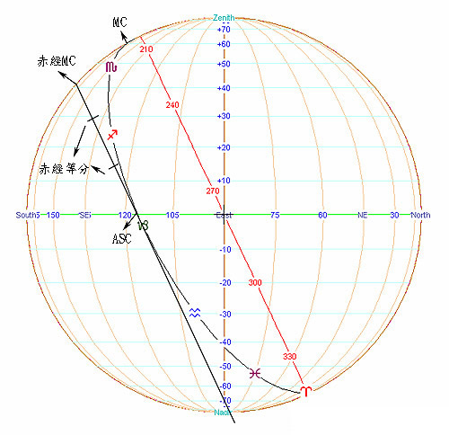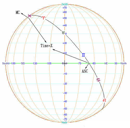 想象你在白天时,面对正南方(天顶一定在地平正南方通过子午线),而这个点刚好是日圈半弧的中点,假设 太阳从命度升起到天顶需时6小时,那么早上6点太阳升起,8点钟时太阳的位置就是12宫头,10点时为11宫头。又假设太阳从天顶降到地平为6小时,那么 正午12点太阳的位置就是10宫头,下午2点为9宫头,4点为8宫头。如此日圈半弧的1、12、11、10、9、8、7等宫头就全部求出来了,其它各宫宫 头也就求出。