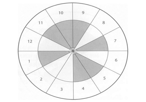 这张图只有七个标明灰色的宫位,你是否看出这些位置的共通点呢?这些宫位就是第一宫,以及与第一宫形成托勒密主相位的宫位。例如第十一宫与第一宫为六分相 (sextile),第十与第四宫都与第一宫形成四分相(square),第九与第五宫与第一宫形成三分相(tdne),第七宫则与第一宫形成对分相位 (opposition)。只有一个宫位与第一宫有形成相位,却没被标明灰色位置的,是第三宫,因为在古典的观念上,这是一个模棱两可的宫位。以此项方 法,若行星落在第九宫,则被认为是好运或者投入等等,但这跟前一张图的判断却不相同。