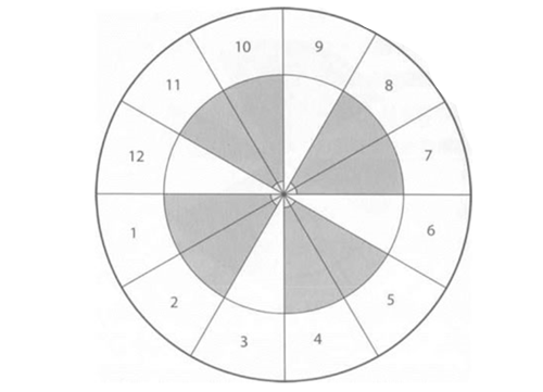 灰色的宫位显示“好运”、“有力”、“忙碌”,或者是“有生产力”(这些形容词以不同的语言来说,会有不同的用词),你应该立刻发现上述所有宫位都是始宫 (第一、十、七、四宫)以及续宫(第二、十一、八、五宫),其余的宫位则为果宫。果宫原文Cadent的意义就是“衰弱”(falling)
