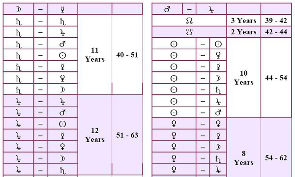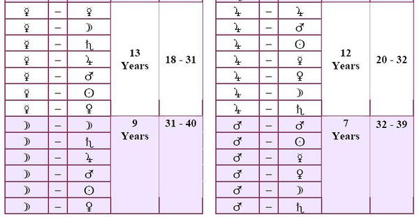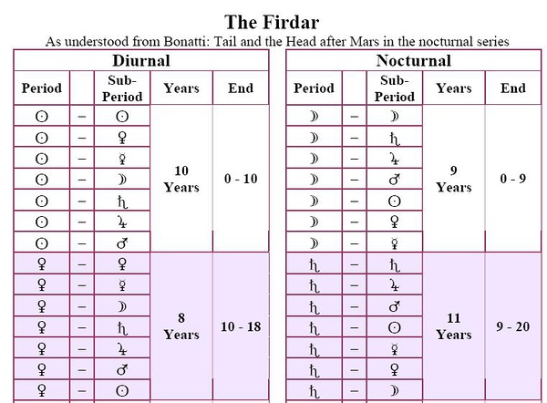 想写点时主的东西,就找了法达的资料,觉得图片很多时候比文字更让人舒服,就简单放点图片(而且国内似乎很少有看到用图表介绍法达的)。 相关的资料可以自己搜索,放一个子辰先生关于法达的文字介绍: http://www.fate543.com/blog/2007/11/18/302/ 主星限和子星限的关系,相当于花瓶和花瓶内容,比如花瓶可以装白开水、牛奶、可乐、粥、当然也可以是毒药等,花瓶也可以采取不同的样式。 比如金-土运,意思是现在走金星主限、土星子限,意思是金星征象的话题是这个大时期的主题,例如婚姻,走土星小限可以代表婚姻最近处在痛苦、平淡、冷战、离婚时期等等。 土星-金星运则相反。 PS:法达有不同系统,需要注意的,相当于印度dashas的超简单版本。