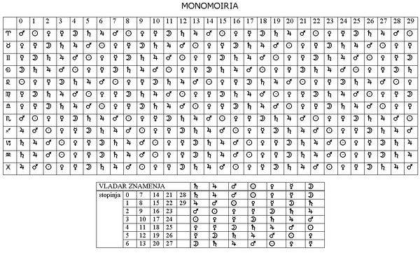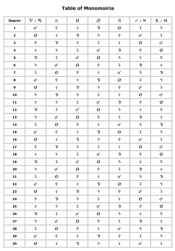 二、Monomoiria最早是最卓越的古占星师Paulus Alexandrinus在其旷世巨作《Introductory Matters》中提到的,有两种系统,本文只介绍最简单和主流的系统,即基于迦勒底降序排列的(Chaldean Order),例如白羊座守护为火星,那么第一个度数为火星,随后的2-30度按照土-木-火-日-金-水-月的顺序循环排序,白羊座的第二个度数即为太阳,第三个为金星,依次按照迦勒底降序排列即可。金牛座守护为金星,那么第一个度数为金星,第二个水星,第三个为月亮,依次类推。