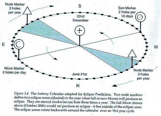 上图显示了埃夫伯里石阵通过在不同的位置摆放石柱来记录月相、预测蚀相的原理。你可以在上面找到代表春分、秋分、夏至和冬至的点,这是适用于全世界任何国家、任何社会的计时原理。