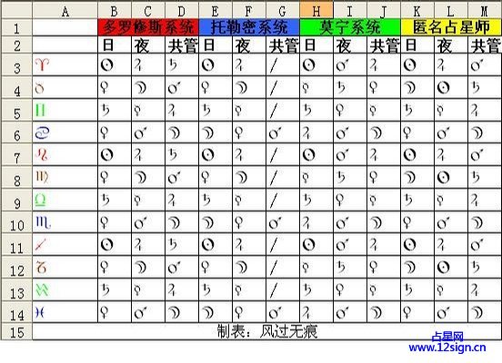 1、有三个星耀守护——日间守护星、夜间守护星、共管守护星(如表所示),相同元素的星座具有相同的三分守护星,如狮子、白羊和射手,他们的三分守护一致。