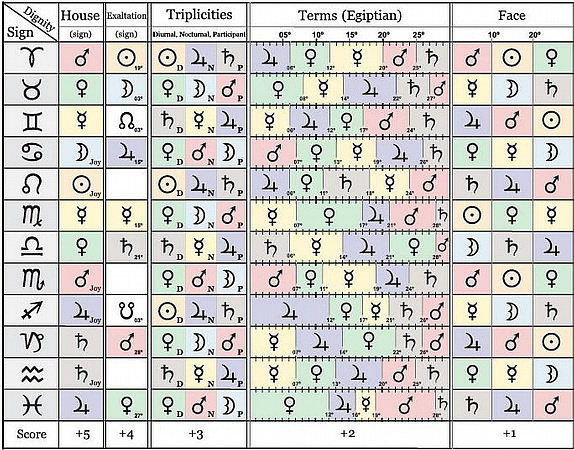 (1)行星A会被出现在A所守护星座内的行星染色或调和,被某颗在A擢升之地的行星激励,得到A担任三分主星星座内的行星帮助,A为界主内的行星能令A保持警觉,A守护的面(face)中行星能给A染色。