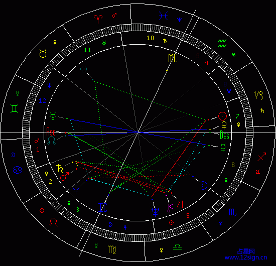 海王星六合冥王星,与天王星和上升相拱,暗示如果诱导他意识到思考过程中积极意志力的必要性,那他的精神状况将会得到改观。