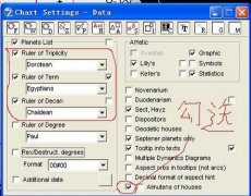 zet8中设置盘主星2010-05-01 23:08:27进入zet8的chart setting-data选项卡中按照红色线条所示的选择选项和勾选即可左边矩形范围内,是选择三分守护星系统、term界系统、dacan/face系统。右边按照指示选择即...