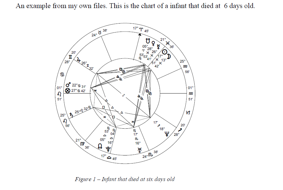 注解4:是没有任何容许度的,也就是1°之内的相位才能纳入出生就夭折的条件之一。 托勒密认为:如果星盘中任意一个光体位于四角,同时任意一颗凶星与光体产生合相,或者凶星位于两颗光体的中点,且此时光体并无任何有助力的相位来脱困,同时光体的定位性落在属于凶星的星座,这时候也应该判断为第一种死亡情况。 第2种情况和1类似,只是2允许有容许度的相位。 案例分析: 这是一个出生了才六天就早亡的婴儿的星盘。