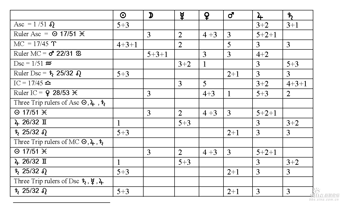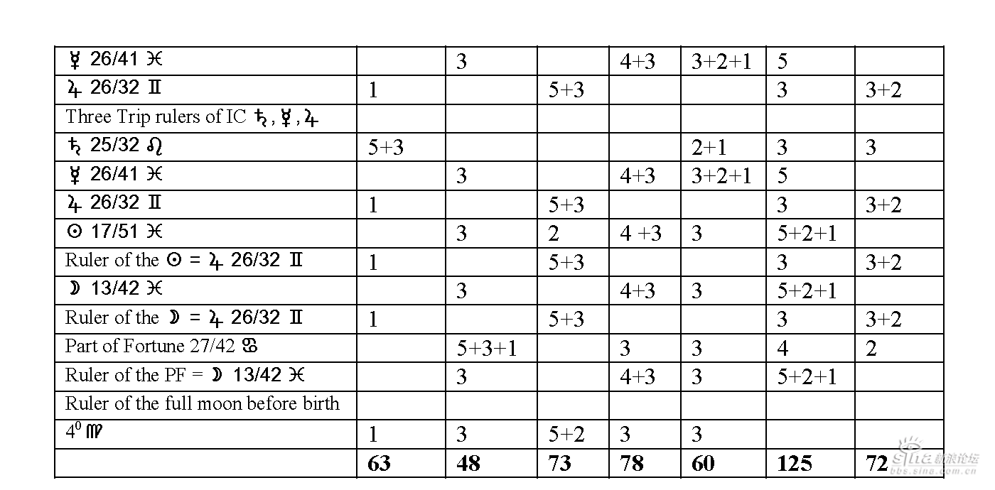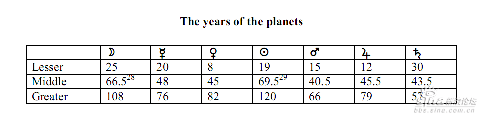 然后就可以按照bonatti提供的范本进行计分排序了。不过这个方法比较麻烦,有兴趣的可以再深入研究一下。 计算出来星盘的almudebit之后,根据星体力量强弱可以对应之前论述的三种寿命情况。也就是从婴儿时期到孩童时期容易出现早夭的情况。