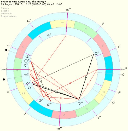 路易十六的生命主为福点,因此寿主星就是火星。按照通行的论断,火星落命宫处女座,应给于分配最大年66年,这是典型未充分考虑宫位细节所造成的失误。在 路易十六的盘中,火星恰为8宫主,因此不应直接给于分配最大年,而应降低一档采用平均年40.5才是正解。因火星在盘中空相,缺少伴星,即无任何加项和减 项,其寿限的计算结果就是40年6个月。