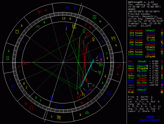 另外,恋爱宫主星水星落入本宫,冲了天王,也显示了你的恋爱运有起伏,有意想不到不愿经历的故事。加上金星的紧张相位,所谓“遇人不淑”是也。