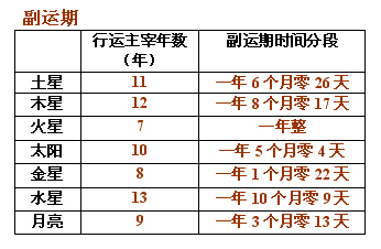 ÐÇÌåÖ÷ÔËÆÚÖУ¬»¹·Ö±ð°üº¬7¸ö¸±ÔËÆÚ¡£¸÷´óÐÇÌ帱ÔËÆÚµÄÔËËã·½·¨Îª£ºÖ÷ÔËÄêÊý³ýÒÔ7£¬µÈ·Ö¸ø7´óÐÇÌ壨²»°üº¬ÁúÊ×Áú⣩£¬ÔÙÓÉ´ËÐÇÌå±¾ÉíÆðÔË¡£