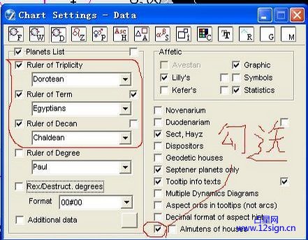 进入zet8的chart setting-data选项卡中 按照红色线条所示的选择选项和勾选即可 左边矩形范围内,是选择三分守护星系统、term界系统、dacan/face系统。 右边按照指示选择即可