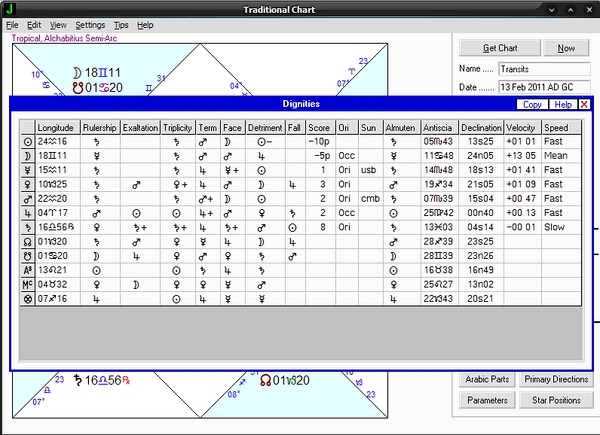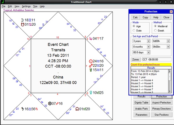 比较特别的是这里的行星相位容许度不再是现代占星依照相位而定,而是古典占星中每个行星规定容许度,然后依照(A+B)/2来判断相位是否在容许度内。 各种栏目也给出了许多选项,像是宫位系统、分宫系统、Triplicity Rulers规则,宫头容许度、行星计分方式等可以满足各种不同需求者使用。 回到主面板单击“Results”可以查看各种统计结果。