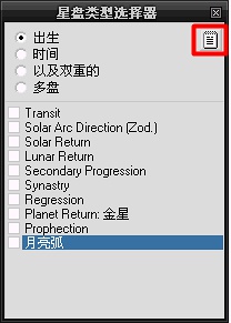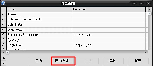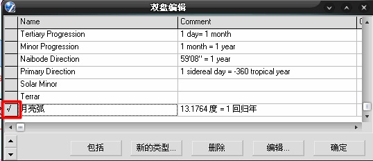 文/KrSpirit 简单的用过两三种占星软件ZET算是用的最习惯的了,特别是推运功能,简便很多,可惜ZET8推运盘一出来就会自动叠盘,在某些推运的时候比较麻烦。这篇文章简单的说明下怎样建立其他推运法。 (网上有两种汉化版,两种汉化版都有许多不足,这里使用占星网的汉化版作为例子。) ZET8推运功能其实已经够用了,但是如果有朋友想尝试下其他新推运功能而其中又没内置该怎样呢?ZET8提供了编辑功能,可以自己按规则建立新的推运法则。 软件有太阳弧推运(基于黄道、基于赤道)而没提供并没人用的月亮弧模式,我们就以新建月亮弧推运(基于黄道)为例。 新建一种推运模式首先要明白此种推运的含义是什么。来简单的复习一下,太阳弧推运是依照一天等于一年的观念,如果要制作一岁(出生为零岁)推运盘则将出生后一天内的太阳移动度数叠加到本命盘中所有关键点上形成推运盘。那么以此类推,月亮弧的推运就是一天等于一年,一岁的推运盘就是出生一天内月亮移动的度数叠加到本命盘中所有的关键点上形成一岁的月亮弧推运盘。这里查询数据月亮一天平均移动度数为13.1764度。需要注意,这里用的是平均移动速度,月亮运动时快、时慢,与运用真实月亮弧推运计算出来的盘会有些许误差。 1.首先进入ZET8的主界面,按F4调出推运选项。单击图中红色圈的文本图标进入编辑模式。