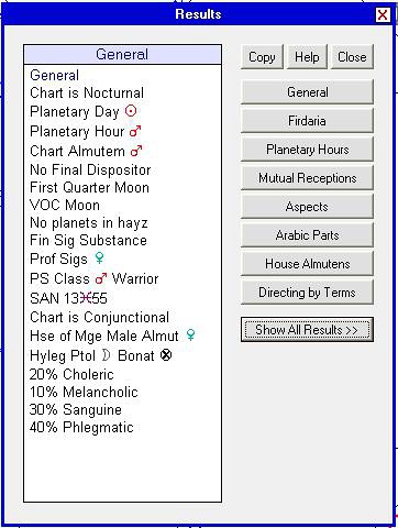 这个是J4软件中世纪占星模块计算的总体结果。 第一栏:chart is Nocturanl,表明盘主是夜生的(星盘的日夜性对凶星的运作、阿拉伯点、法达等等的计算有重要影响) 然后下面的几栏依次为日主、时主、三大盘主之一、最终定位星、月相等。 然后SAN是出生前新满月点。 然后是hyleg的计算(三大盘主之1,跟命运和寿限的计算有关) 最后是Temperament分析,就是类似性格气质类型分析的,如多血质、胆汁质、粘液质、抑郁质的分析。 3、