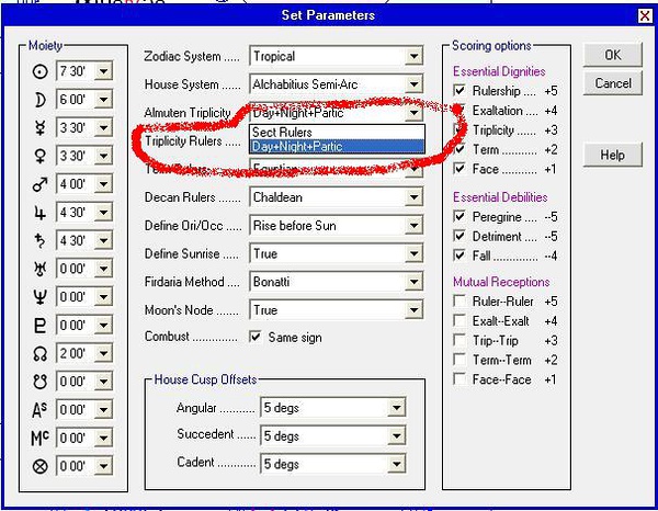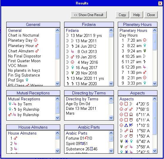 这个就是是J4软件中世纪占星模块计算的详细结果。 第二大栏是法达--中世纪占星运用的简单时主模型 第三大栏是小时主的概念 第四大栏是不同层次digitny的互容 第五大栏是界主推运 剩下的是相位、宫神星、阿拉伯点等分析。 4、然后就是R.zoller风格的三分主星计分法则。