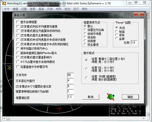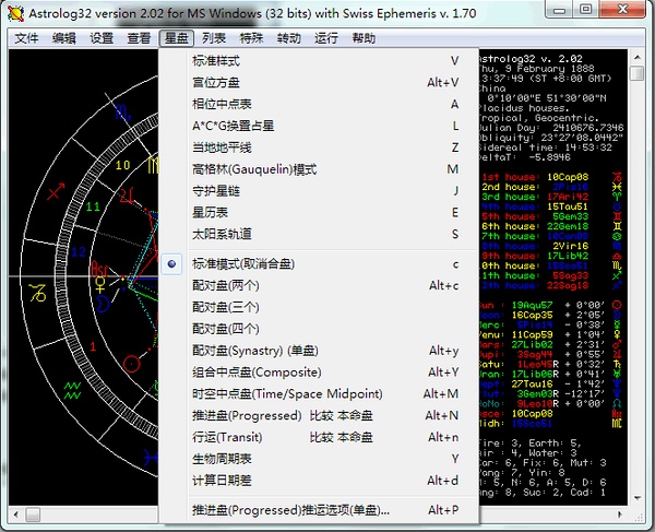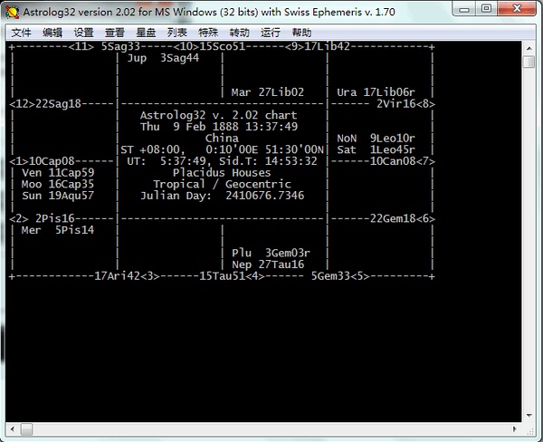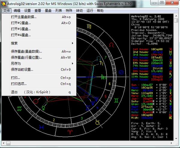 *程序名称:astrology32 *版 本:2.02 *汉 化:KrSpirit *日 期:201003 *下载地址: http://dl.dbank.com/c0pbvbg3q5 http://ishare.iask.sina.com.cn/f/17998307.html *快速入门手册: 在线版 http://www.douban.com/note/166448918/ http://dl.dbank.com/c09ujf8sdx http://ishare.iask.sina.com.cn/f/17998308.html http://ishare.iask.sina.com.cn/f/17998309.html *注: 语言文件DLL未加密、未压缩,以便有意的朋友可以自行查看修改。 英文原版的DLL也在目录下,想用英文版的同学将后缀更改一下替换文件即可。 *便捷版更新说明: 有网友在微博上提醒原版的程序不好下载,于是趁此机会顺便将之前的缺漏完善。 1.将地图集文件纳入,可以如1.34版本一样搜索经纬度。 2.附带Dat配置信息文件,方便快速使用,无需一步步配置。 3.底色更改为黑色。 4.写了一份简单的快速入门,以便刚接触的朋友使用。 汉化初衷:由于旧版的汉化版汉化的并非很全面,虽然很多功能并非用的到但也会让第一次接触的朋友有些迷茫,所以自己着手尝试软件的各种功能将每个菜单选项都尽力贴切的汉化出来,如果发现汉化有误的地方,可以豆邮说明。 Astrology32是国内使用最广泛的免费占星软件,可以简便快捷的排出一个星盘,此版本是Astrology32的最终2.02版,于2007年5月最后更新。汉化的原因是网上大部分还在使用1.34旧版软件,而且其中许多地方汉化有误差与缺漏。于是着手自己汉化了一个版本。 翻译时借助SCF汉化的1.34版为原型,仔细的琢磨了了2.02版本词句,尽力达到词句简短准确,感谢最初汉化者汉化的版本与葵葵的帮助。 软件中容易造成混淆的专业名词都附上了英文,如果不理解意思可以直接将翻译词句到搜索引擎搜索能获得相关介绍。原软件有些怪异的单词拼写方式经搜索后擅自更改例如:Mollewide Projection改为Mollweide projection(摩尔魏特投影)、Moiré pattern改为Moire pattern(莫尔图)。还有其他一些小地方未能一一记录。软件地图集设置中有两段冗长的无意义英文就不翻译了,反正用不到。 查询经纬度这里推荐个中文网站运用Google地图可查全球经纬度:http://www.itouchmap.com/latlong.html 与 http://www.jkxy.com/astro/gmap